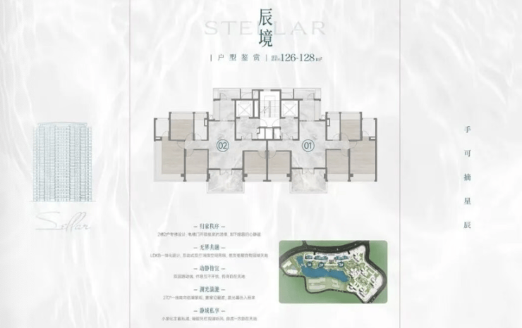 园林规划:岭南新中式园林 “辰园十景”,三重归家礼序,人均绿地为常规高层 2.3 倍,打造低密湖居生态秘境。
