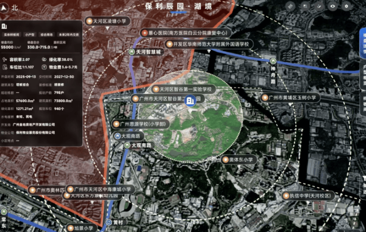 保利辰园湖境为保利发展在天河世界大观板块打造的低密湖居标杆,总占地5.76 万㎡,总建面7.38 万㎡,容积率仅 2.07,是天河罕见超低密度湖居大盘。