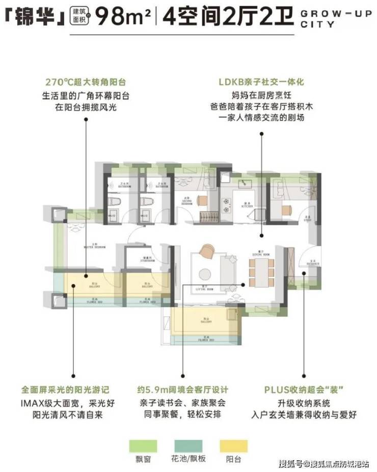 亮点:南北对流+主卧270°转角窗,使用率95%;