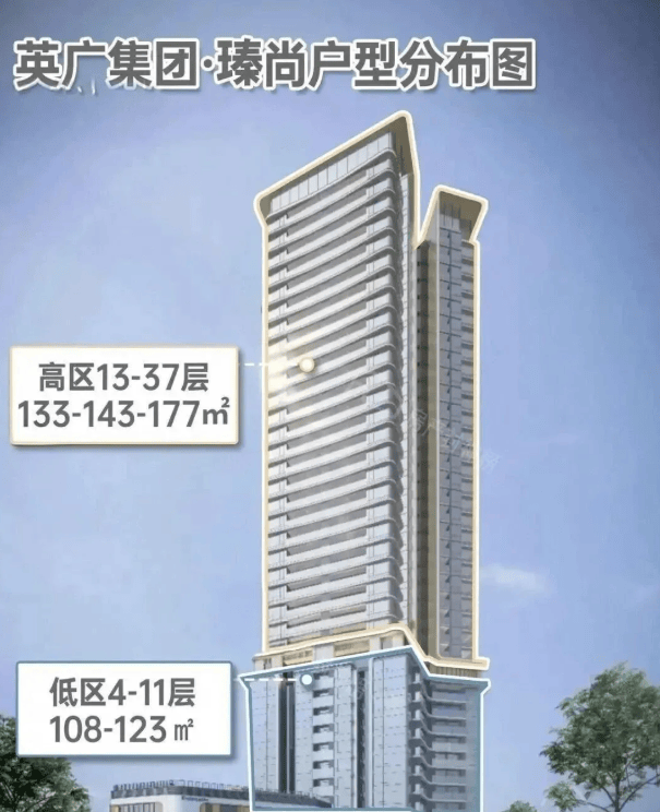 高区(13-37层):主推建筑面积约133至177平方米的四房。