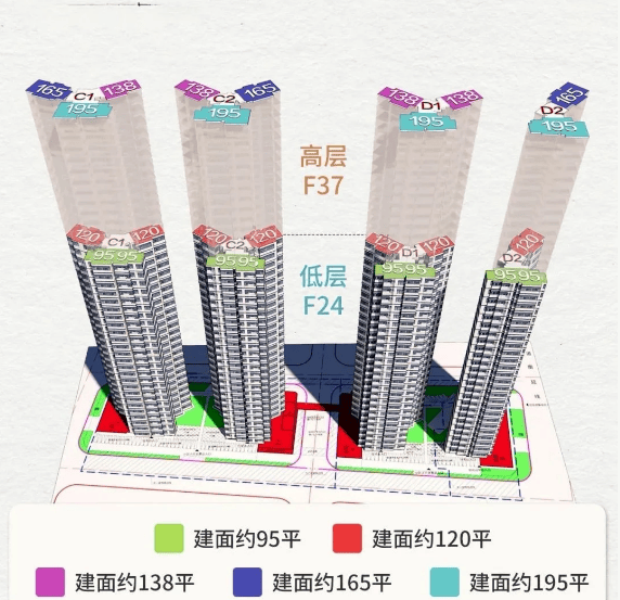 根据广州市住建局备案数据及项目官方发布的信息显示,项目目前主力在售C1、C2栋及新推D1、D2栋,其中低区(3-23层)为两梯四户设计,主打95-116㎡的四房两厅两卫户型,面向改善家庭;高区(25-37层)升级为两梯三户设计,主打131-195㎡的瞰江大平层,针对高净值改善客群,产品线布局合理,能满足不同购房者的需求。