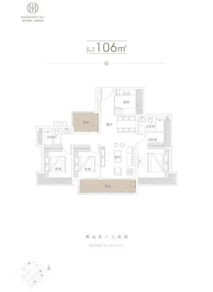 106㎡三房两厅两卫:南北通透,双阳台设计,厨房连接生活阳台,空间布局方正,无浪费面积,总价 170 万起;