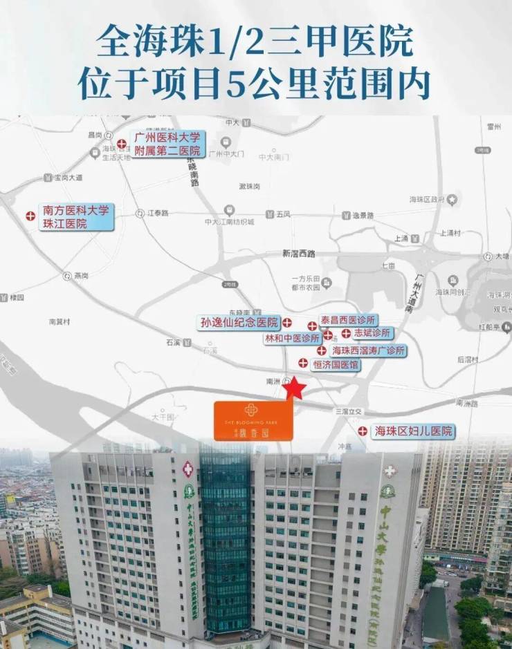 约750米中山大学孙逸仙纪念医院(三甲)约1.5公里海珠区妇儿医院约3.5公里南方医科大学珠江医院、广州医科大学附属第二医院。