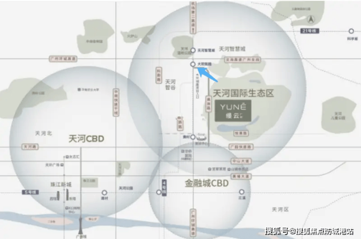 合生缦云位于天河智谷核心区,东临科学城、西接金融城、南望珠江新城,形成“15分钟高端资源圈”: