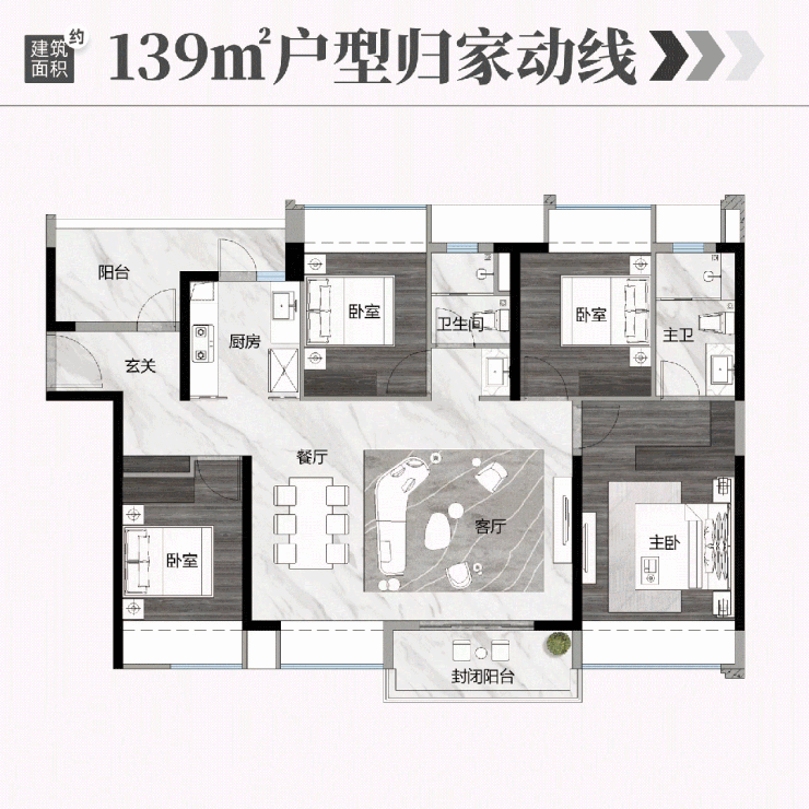 118 平户型全屋四空间,进门有独立玄关,收纳能力超强。全屋南北通透四开间朝南,公区约 25 平厅为核心,LDK 一体化设计,家庭场景切换自如。约 6.6 米宽景阳台,观景、采光一流,还能变成全家人的第二客厅,爸爸弄花园,妈妈做瑜伽,傍晚一家人品茶看晚霞。超大 U 型厨房,爸妈一起做饭也不挤,烹饪动线流畅。“三进式” 主套,衣帽间、私卫都有,生活仪式感满满。