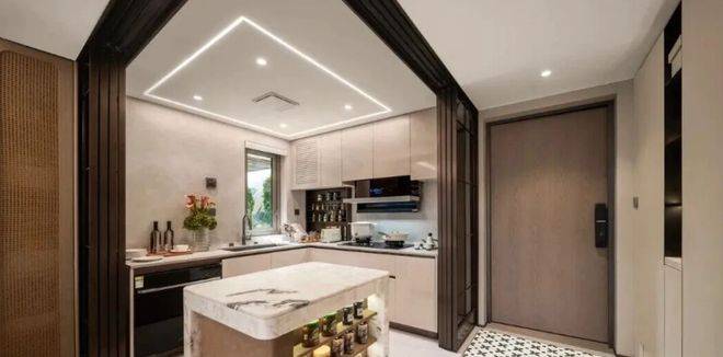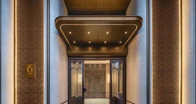 建筑和户型设计充分体现新规优势,使用率普遍超高,部分达到125%以上。层高高达约9米的大堂,引入圆弧吊顶设计,吊顶后约6米,进门气度非凡。地下光厅延续首层风格,海浪绿岩板搭配海棠纹星空顶,地库归家也充满奢华酒店氛围。大门近9米高、50米宽,印度绿奢石纹理如泼墨山水,香槟金金属飘檐,大宅气派尽显。门口百年老桩米兰树形似迎客松,又带独特香味,细节经得起推敲。交标标准高,铸铝大门经特殊工艺处理,经久光亮。玄关地面拼花设计,每一寸都折射光影美学。天花采用无主灯设计,简约大气,融入轻奢风格。入户玄关配备800库玄关柜,鞋服包箱行李全收纳。卫生间首创200库隐形储物格,主卫嵌入式美妆冰箱、一体收纳架等细节特别贴心。方太全隐升降抽油烟机,吸力1200Pa,美观实用。主次卫平权配置,恩仕轻智能马桶、顶喷、高仪双花洒+顶喷、暖风浴霸四合一,全方位提升生活品质。