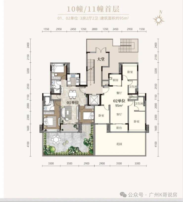 特别值得一提的是北区的首层与顶层产品。首层单位(如10幢/11幢二层01、02单位),建筑面积约97平方米,三房两厅两卫设计,配备南向花园与储物间。拥有一方属于自己的私家花园,种花养草、烧烤聚会,是许多人的梦想。对于有老人小孩的家庭来说,花园更是孩子玩耍、老人锻炼的天然场所。