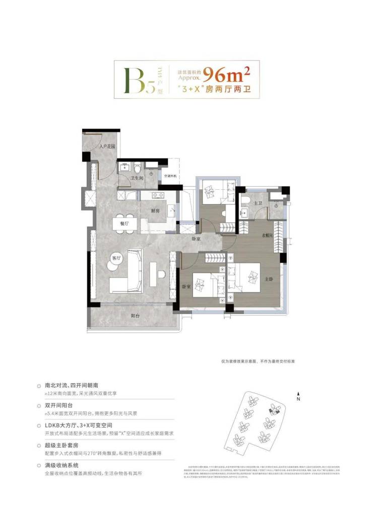 空间革命:通过可变隔断设计,交付时为三房(客厅开间5.4米),后期可灵活改造为四房;