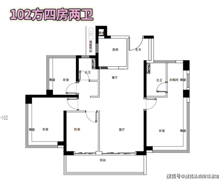 102㎡四房两厅两卫:南向户型,可看花园,高层可部分观赏河景,但需注意部分房源门对门设计。