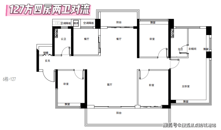 127㎡四房两厅两卫:南北对流双阳台,主阳台看花园,但低层北向朝客运站,高层朝马路,噪音不可避免。