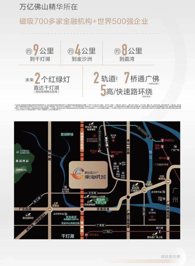 交通网络已经很扎实,未来还会更强。周边规划两条轨道:南海有轨电车T1线镇南大道站直线约2公里,佛山地铁8号线约2公里。7桥通广佛,包括广佛大桥、同心桥、沉香大桥、水口大桥、黄歧一桥、碧江大桥、金沙洲大桥。5高快速路环绕:佛山一环、桂和公路、沈海高速、桂澜路北延线、广州环城高速。项目临广属性明显,“比广州更近广州”,对广佛通勤族特别友好,承接广州人才外溢的第一梯队。