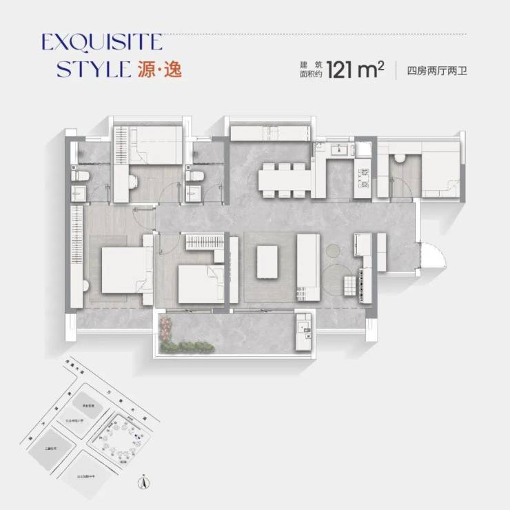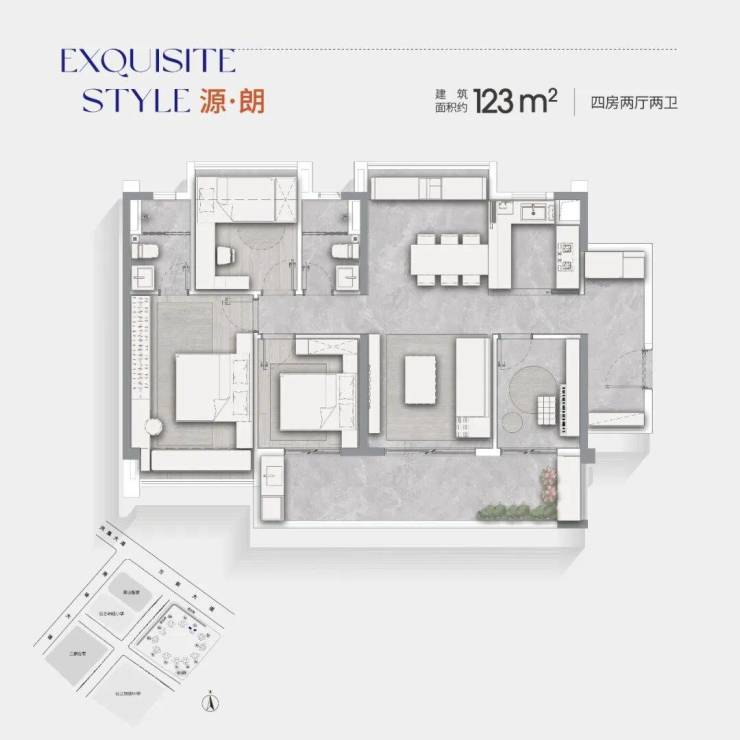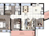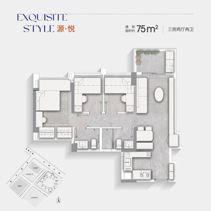 项目首期推出多种实用格局的三至四房户型,面积范围从约75㎡到约123㎡不等。所有户型均采用南北通透设计,提供全明采光、通透对流的居住体验。LDKB一体化设计、开放式厨房以及高赠送率的阳台和飘窗,使得每个户型都达到了约100%的得房率。