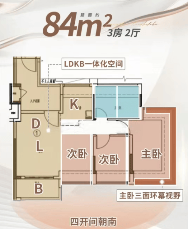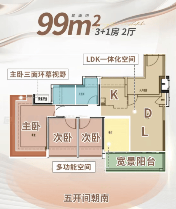 建面约99㎡:四房两卫,采用IMAX宽景阳台设计,主卧享有三面环幕视野。