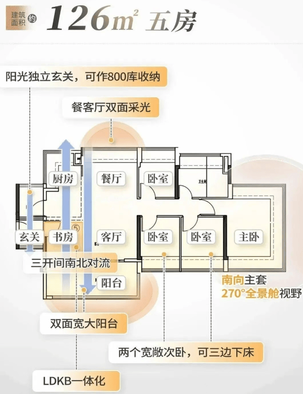 建面约126㎡:五房两卫,5.5开间朝南,南北对流通风,双面宽大阳台,客餐厅尺度宽敞,适合大家庭居住。