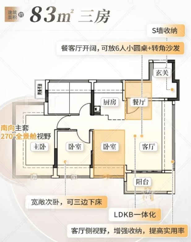 建面约83㎡:南向三房两卫,单边位设计使得套内使用面积更大。