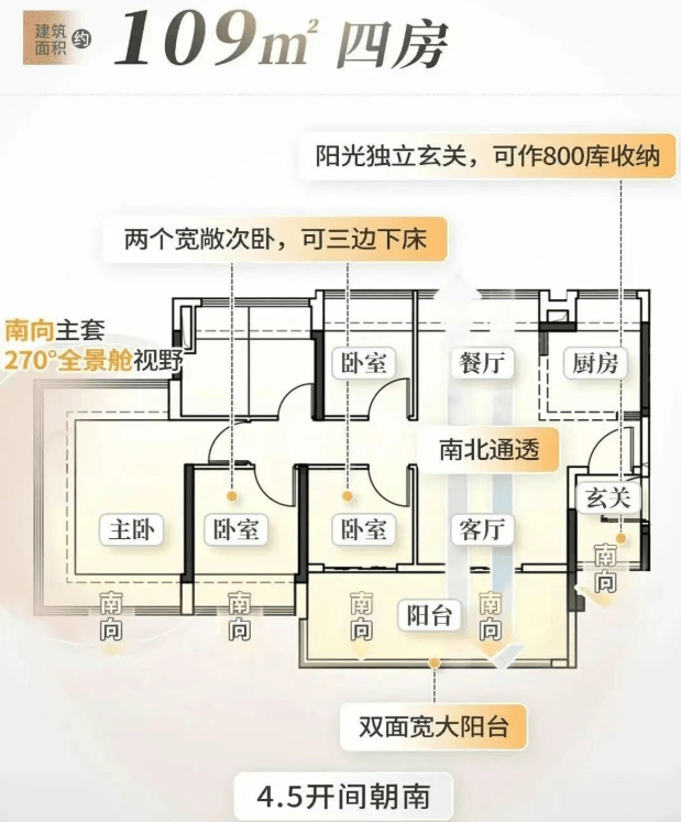 建面约109㎡:四房两卫,南北对流设计,通风采光效果佳,两个次卧足够大,能够容纳更多家具。