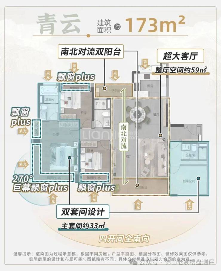 高端顶改:建面约173㎡、183㎡四房,南北通透,全明空间。