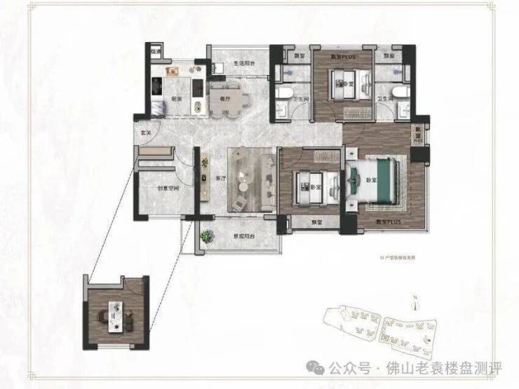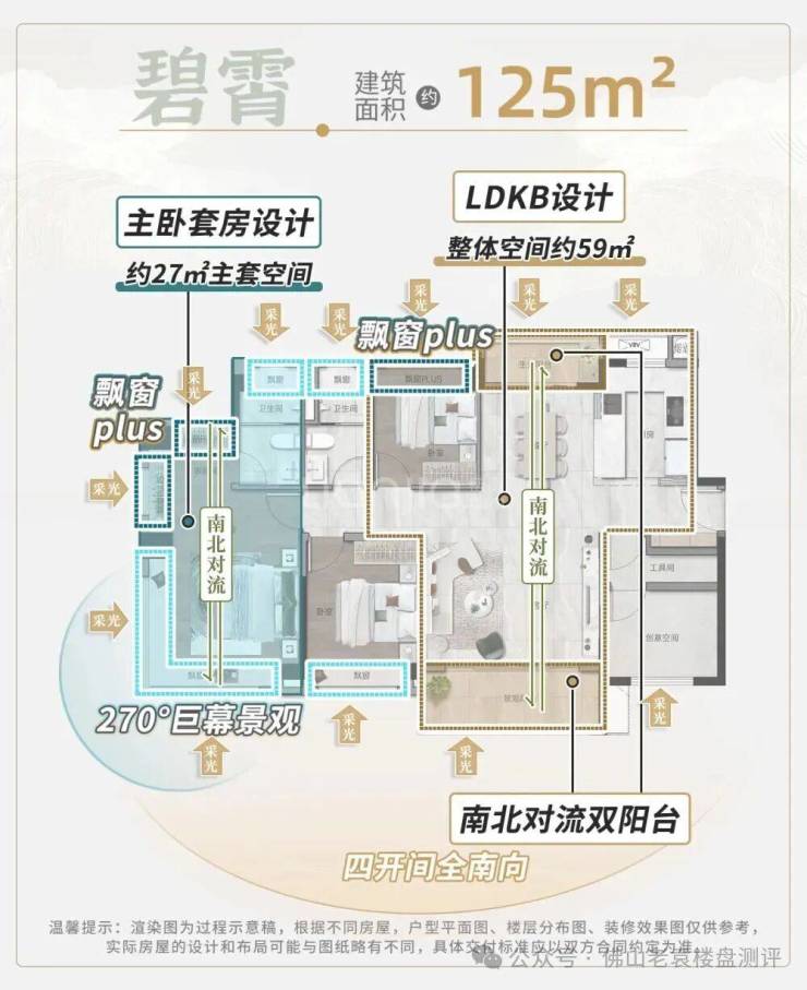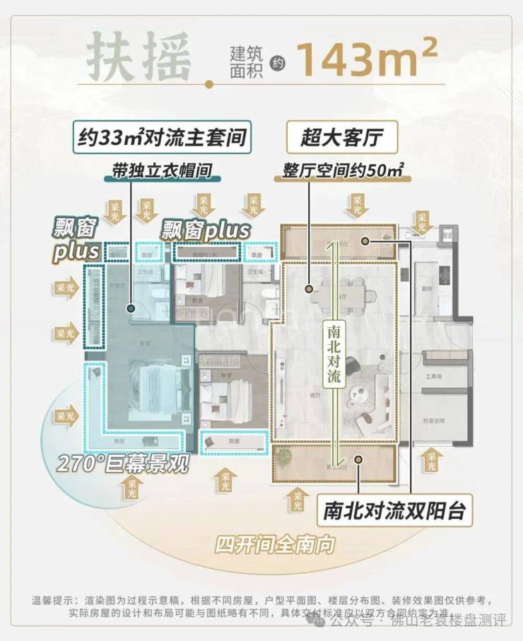 改善主力:建面约128㎡、143㎡四房,LDKB一体化厅堂,主卧带270°飘窗。