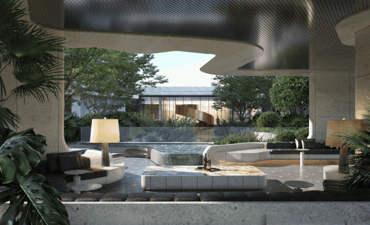 第二重|约9.5米奢石入户大堂,看齐全广州10万+豪宅标准。底层立柱采用香格里灰石材,正门采用加纳白石材,地面采用了高级的拼花铺贴技术,提取黄边艺术公园内的睡莲形态,为每一位业主营造出充满艺术格调与尊贵的归家体验。