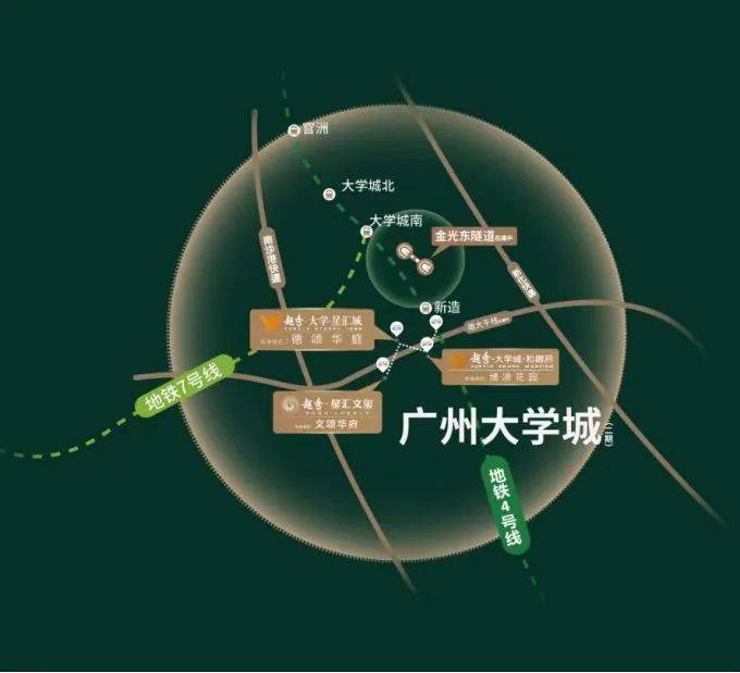 越秀大学星汇城距离4号线新造地铁口仅约900米,步行可达。通过地铁可以轻松到达琶洲、金融城等多个CBD区域。此外,项目紧邻南大干线和金光东隧道,自驾出行也十分方便,10分钟内可抵达万博商圈,半小时内可达琶洲、金融城等核心区域。