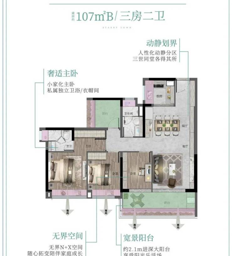 107㎡A 南向四房两厅两卫:4.5开间朝南,客厅主卧南北对流,配备5.9米长观景阳台,交互式方厅设计。