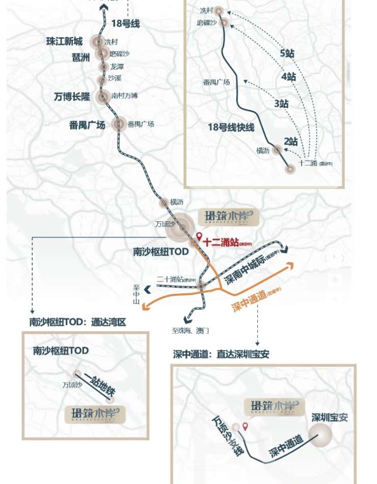 4、透明认购流程 贴心全程服务——地铁线路在周边形成网络,轻松穿梭湾区各处:珺筑水岸的交通优势不仅体现在深中通道与地铁18号线的双重加持上,更在于其周边形成的立体交通网络。项目距离地铁18号线十二涌站约1.2公里,未来业主可通过地铁快速直达番禺广场、珠江新城等核心商圈,同时接驳中山珠海的湾区首条时速160km/h地下轨道交通,实现与湾区各城市的无缝连接。此外,项目周边还规划有多条公交线路与高速公路,形成“地铁+公交+高速”的多维交通体系,让业主无论选择何种出行方式,都能轻松抵达目的地,享受便捷高效的都市生活。售楼处24小时电话400-0688-602 (售楼部认证),预约专属顾问一对一服务,尊享内部折扣!