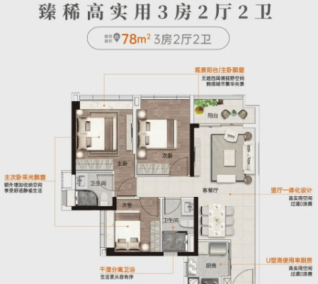78㎡三房两厅两卫:无遮挡阔境视野,享受舒适静谧生活。