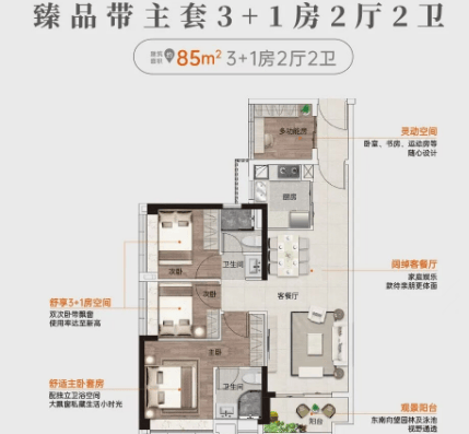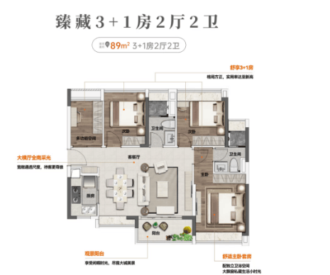 85/89㎡四房两厅两卫:东南向望园林及泳池,使用率达到新高,适合追求宽敞空间的家庭。