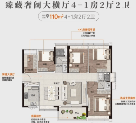 110㎡五房两厅两卫:全面满足三胎或三代同堂大家庭需求,极致面积做五房,价格相比同户型更为优惠。