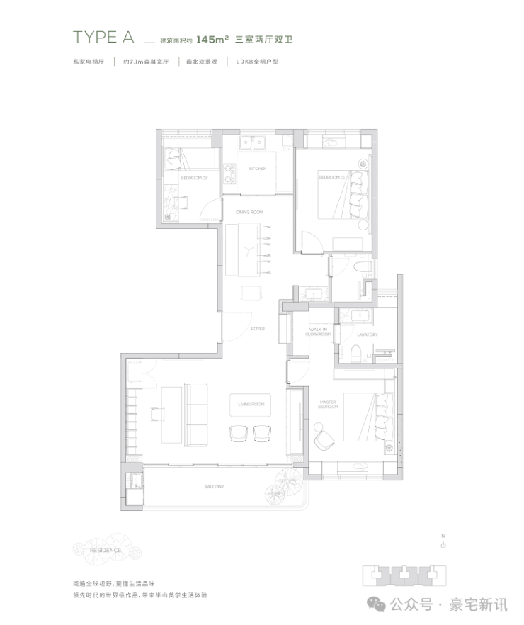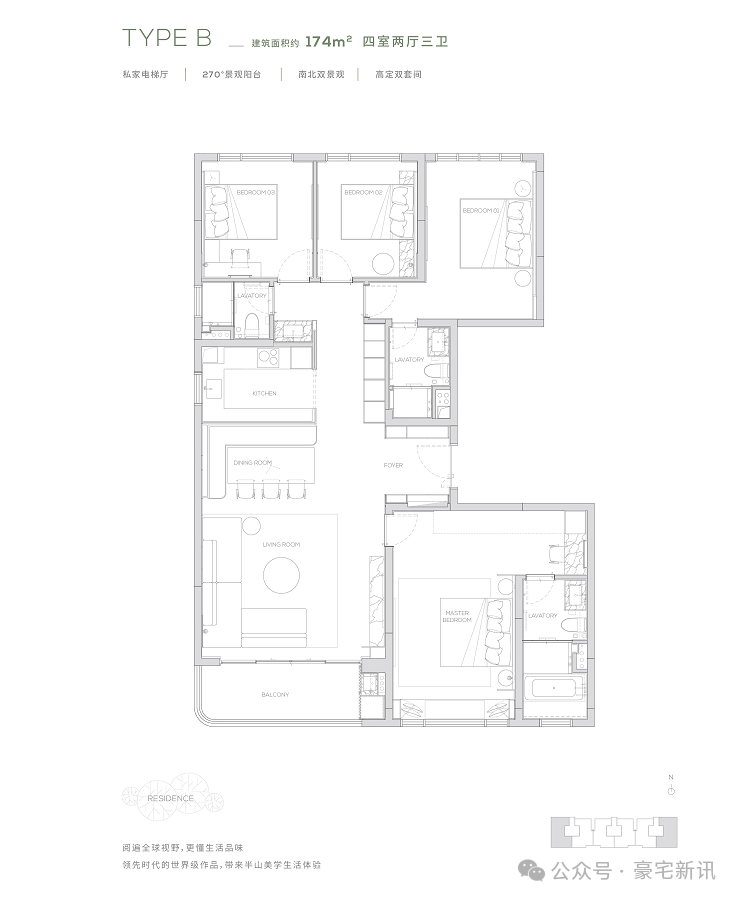 亮点:专梯专户,私家电梯厅;270° 观景阳台,俯瞰林海与双湖;得房率高达 90%,空间无浪费。
