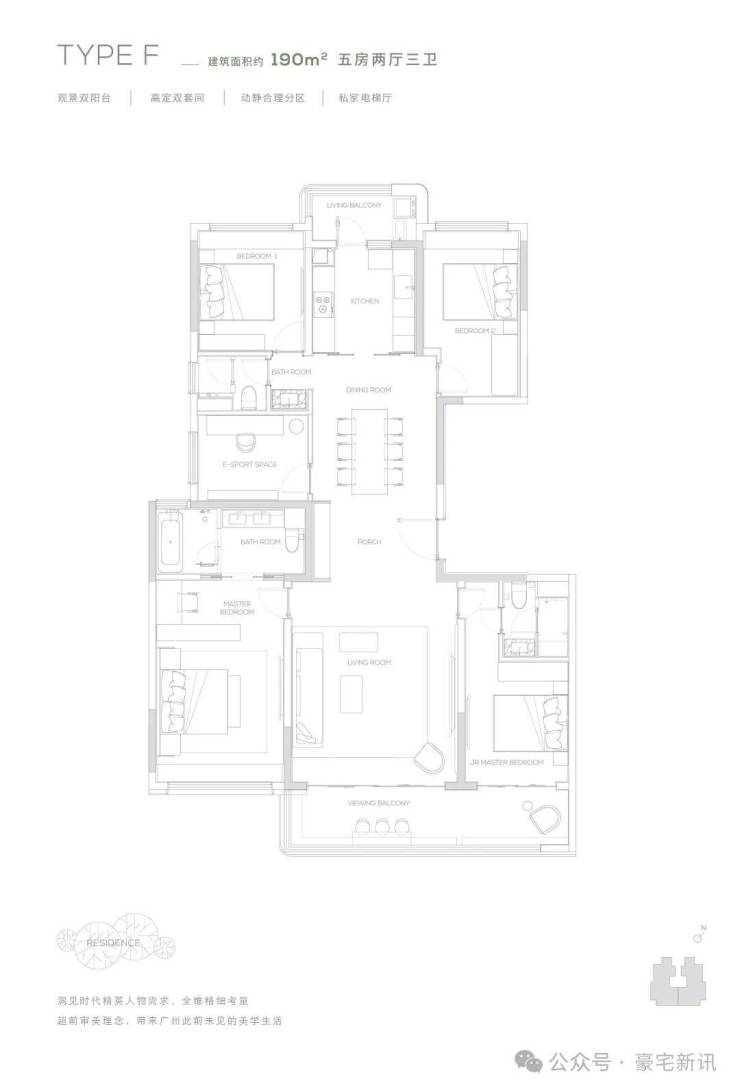 格局:端户边厅设计,270° 环幕观景阳台,视野无遮挡;主次双套房配置,满足多代同堂需求。