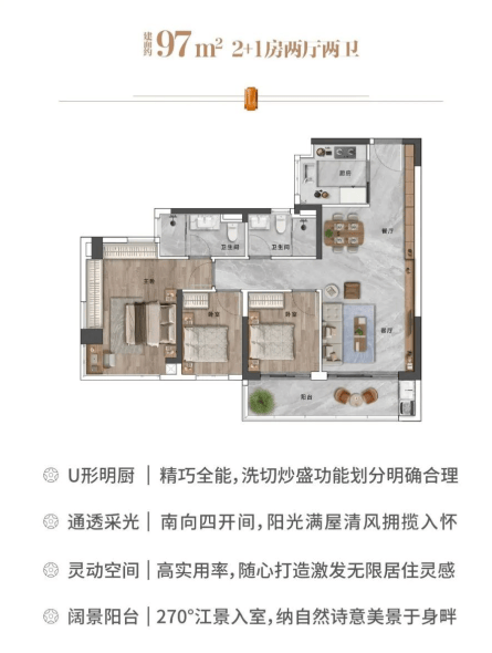 首推的 97㎡三房两厅两卫户型,是刚需家庭的理想入门之选。户型格局方正,空间利用率高,无浪费面积;三开间朝南设计,最大化引入阳光,客厅与阳台相连,采光通风俱佳,让室内时刻保持明亮通透;主卧配备独立卫浴,保障居住私密性,次卧面积匀称,可灵活规划为儿童房或书房,满足二人世界、三口之家的居住需求;U 型厨房设计,烹饪动线合理,操作空间充裕,满足日常家庭烹饪需求;卫生间干湿分离,提升使用舒适度与安全性,细节处彰显人性化设计。