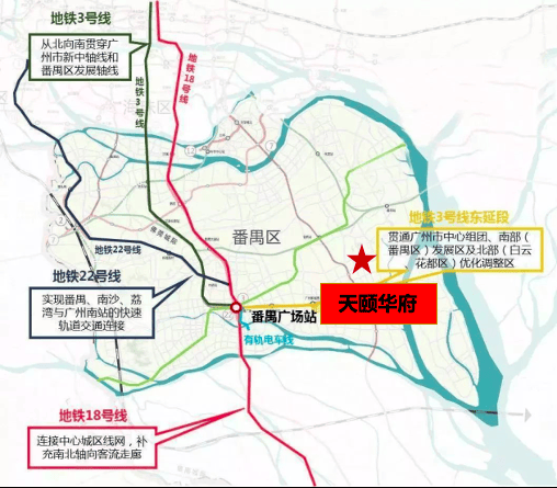首先,从板块站位来看,项目位于广州第三中轴——番禺广场的“心脏”。这里是番禺的政治、经济、文化中心,也是3号线、18号线、22号线、规划17号线、规划26号线五轨交汇的超级枢纽。根据《番禺区国土空间规划》,这一板块将建成继珠江新城之后,广州南部的第二个经济文化中心,而天颐华府正是这片繁华中的“静谧后花园”。