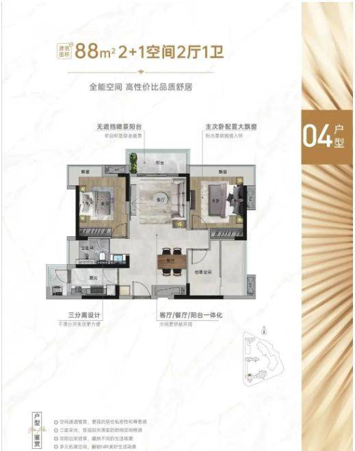 90%以上户型为纯南向板楼设计,南北通透,客厅、卧室及餐厅动线合理。主力户型88-122平方米三至四房设计,大面宽短进深,空间利用率高,部分户型配置观景阳台、步入式衣帽间,满足家庭日常生活及收纳需求。