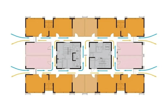 双环通走廊设计:摒弃传统单过道设计,采用双环通走廊,极大提升通风采光效果,同时户户单边设计,确保了私密性和舒适度。