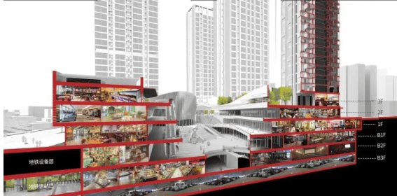 开放式商业综合体:项目采用了罕见的开放式商业综合体设计,地下三层商业MALL接驳双地铁,地上三层公园购物街区,为消费者提供了一个舒适的购物环境。