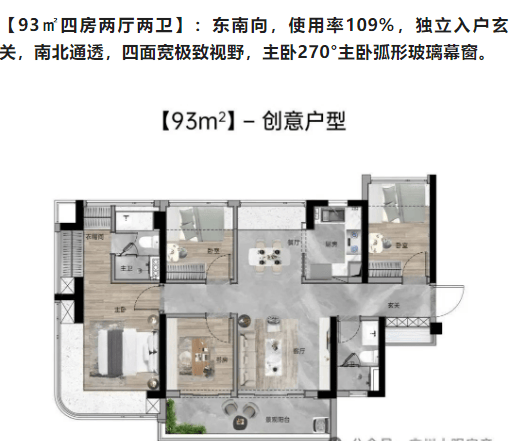 93㎡四房两厅两卫:东南向,使用率109%,独立入户玄关,南北通透,主卧同样设有270°弧形玻璃幕窗。