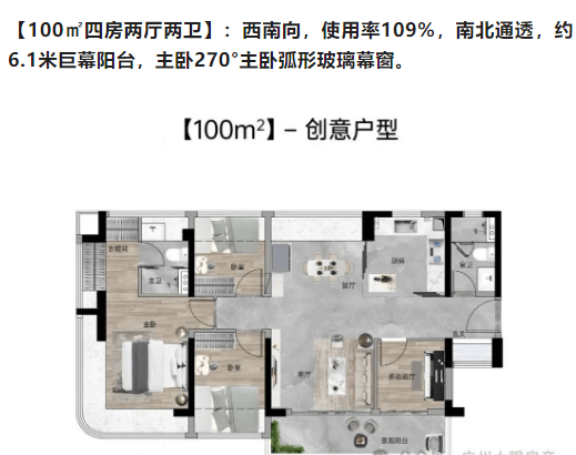 100㎡四房两厅两卫:西南向,使用率109%,南北通透,约6.1米巨幕阳台,主卧设有270°弧形玻璃幕窗。