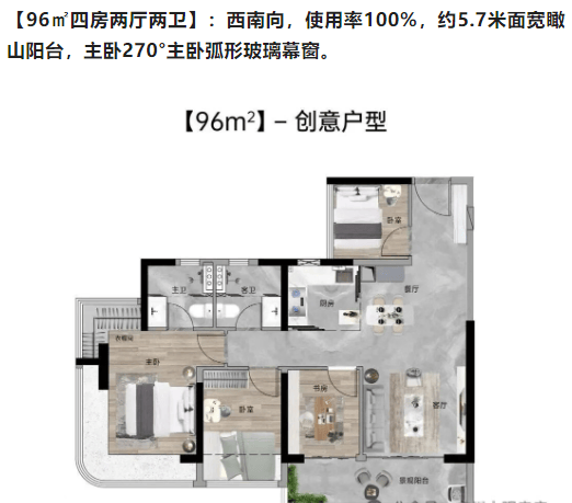 96㎡四房两厅两卫:西南向,使用率100%,约5.7米面宽瞰山阳台,主卧设有270°弧形玻璃幕窗。