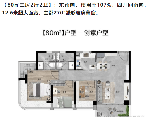 80㎡三房两厅两卫:东南向,使用率107%,四开间南向,主卧设有270°弧形玻璃幕窗。