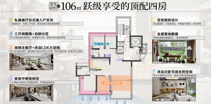 空间魔法:通过飘窗+设备平台拓展,实际使用面积超106㎡(得房率85%)。