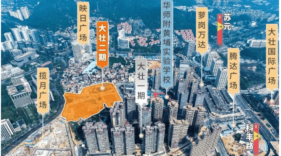 教育上,家门口就是华南师范大学附属黄埔实验学校(南校区),分南北校区,共设幼儿园 36 个班、九年一贯制学校 72 个班,小学部目前只招收大壮名城、暹岗转制社区符合政策的适龄孩子,实现 12 年目送式教育。商业方面,周边已有萝岗万达广场等多个商业广场,大壮映日广场已封顶,大壮国际广场 A/B 地块将打造广州第二家超五星级购物中心,还有揽月广场等。此外,周边多个公园环绕,有三甲级别的中山附属第三医院岭南医院,内部规划约 2.5 万方园林,由国际设计团队打造 “3D 立体度假园林”,融入全龄段生活空间。