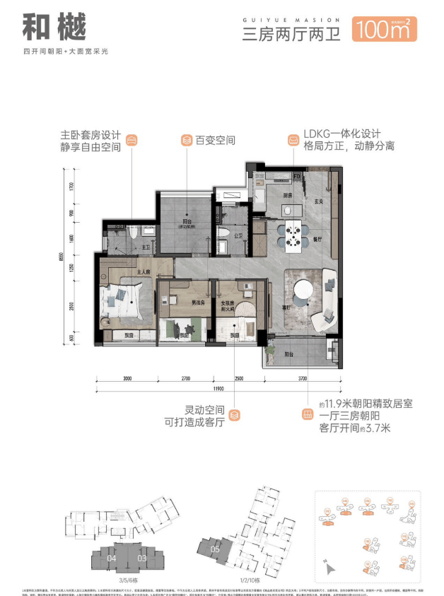 100㎡户型:该户型设有3.7米宽的阳台,四开间朝南,整体动静分离,赠送面积多,实用率高。