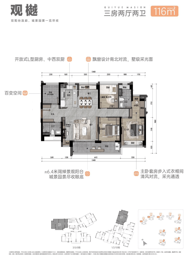 116㎡户型:配备约6.4米的IMAX视野跑道式阳台,多功能生活场域设计,开放式L型厨房采用洄游式餐厨动线,主卧套房内设约5.5㎡的独立衣帽间,彰显豪华与舒适。