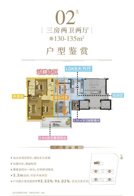 130㎡三房两厅两卫:小高层产品,采用板式设计,层高达到3.3米,户户双阳台设计,进深最大可达2.4米。
