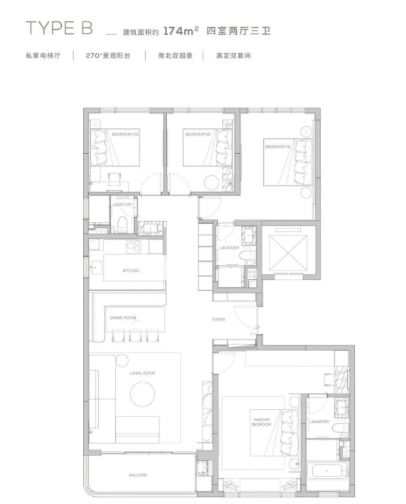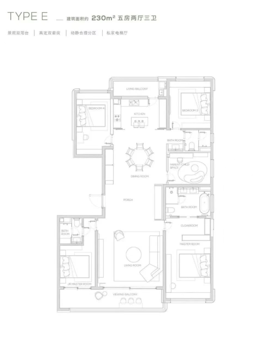 户型设计:主推125-260㎡三至五房,南北通透,得房率高达85%;