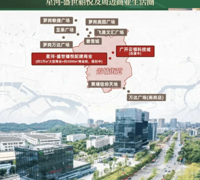 星河・盛世禧悦周边商业配套正逐步完善,具有较大的发展潜力。项目自身规划有约 3000㎡商业街和约 3.3 万㎡大型商业,建成后业主下楼即可享受逛街、看电影、用餐等便捷生活,极大地满足了居民的日常消费需求。沿着开创大道,周边 5 公里范围内汇集了萝岗万达、星际云汇、香雪城(在建)等约 300 万方醇熟商业,为居民提供了丰富多样的购物、娱乐选择。