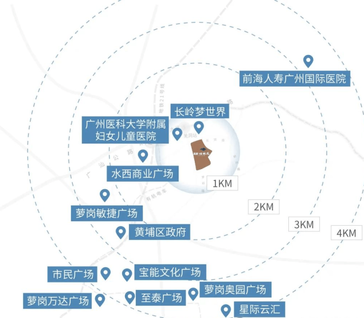 项目与黄埔区有轨电车 1 号线长岭居小学站直接相连,距离仅 590 米,乘坐 2 站即可接驳地铁 21 号线长平站,并可一站换乘地铁 6、7 号线,畅达全城。