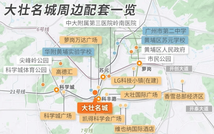 大壮名城·名门的地理位置极具优势,地处科学城核心区域,周边交通网络十分完善,尤其是地铁出行方面,堪称“三地铁环绕”,为业主的日常出行提供了极大的便利。项目家门口就有已开通的6号线、21号线苏元站,以及新开通的7号线二期,三条地铁线路交汇,轻松通达广州全城。