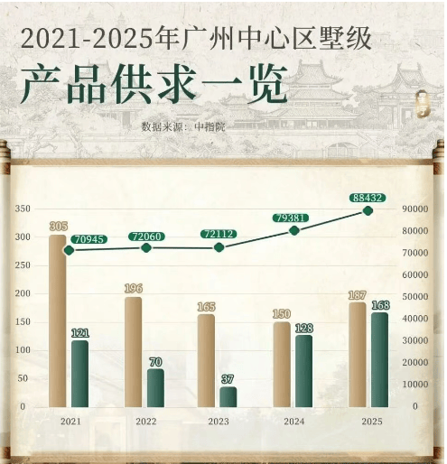 令人意外的是,在海量新房中,墅级优质产品却逆势突围,成为楼市硬通货。近5年,广州墅类产品供应仅524套,成交量却高达1003套,供需缺口显著,不少优质墅级房源推出后短短数月便售罄,上演“一房难求”的抢房热潮。这背后,是改善型购房者对“优居”的极致追求——告别超高层的拥挤压抑,渴望低密、通透、私密的居住体验,而这样的产品,在核心地段早已难寻。